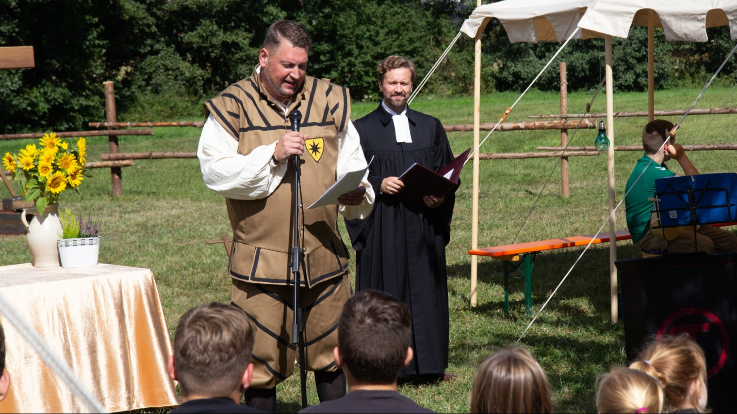 Nach rund vier Stunden und knapp 13 Kilometern erreichten wir schließlich unser Ziel – die Bruchmühle in Neudorf. Dort ließ Stephan Böhne mit einer kurzen historischen Exkursion die Vergangenheit der Bruchmühle lebendig werden, bevor unser Hauptmann Marcel Kinold ein paar Worte an die Gruppe richtete.